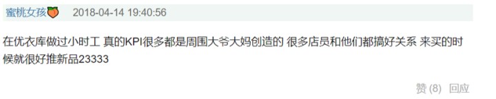 豆瓣上,有曾在优衣库兼职的网友表示,“大爷大妈”才是隐形的超强购买力。许多优衣库的店员都日常和他们维护好关系,这样才能在上新品时推一波业绩。