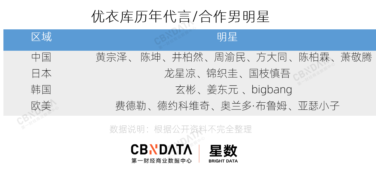 根据CBNData星数不完全统计,优衣库历年来与近20位男明星进行过代言或者推广合作。从名单来看,虽然国家地区有所不同,但大部分代言人的形象和广告风格都保持了清新、自然的风格。