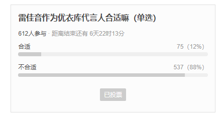 面对这波操作,网友们的看法似乎有些一边倒。在一项关于雷佳音是否适合成为代言人的投票中,不适合的选项以88%的压倒性优势获胜。