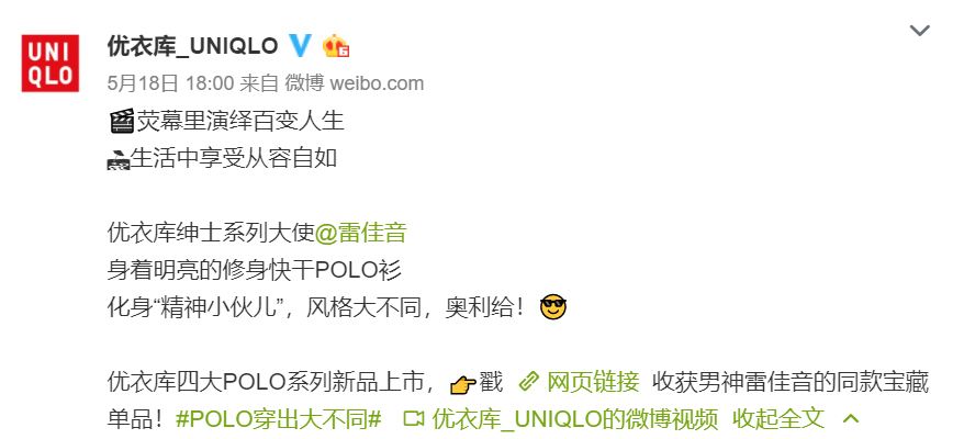 5月18日,优衣库官宣雷佳音为绅士系列大使。官方微博释出的广告物料中,雷佳音身着明亮的修身快干POLO衫,满脸笑意。