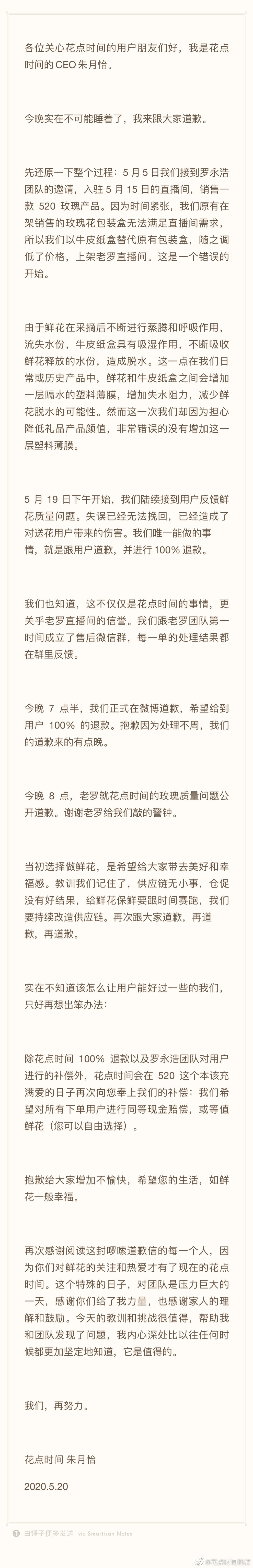 继罗永浩致歉后,花点时间官方也作出保证称,对用户表示抱歉,并将对不满意的用户100%退款。“520是甜蜜的日子,非常非常抱歉,给大家添堵了。千言万语汇成一句——您对收到的花有任何不满意,我们都为您做100%退款。”