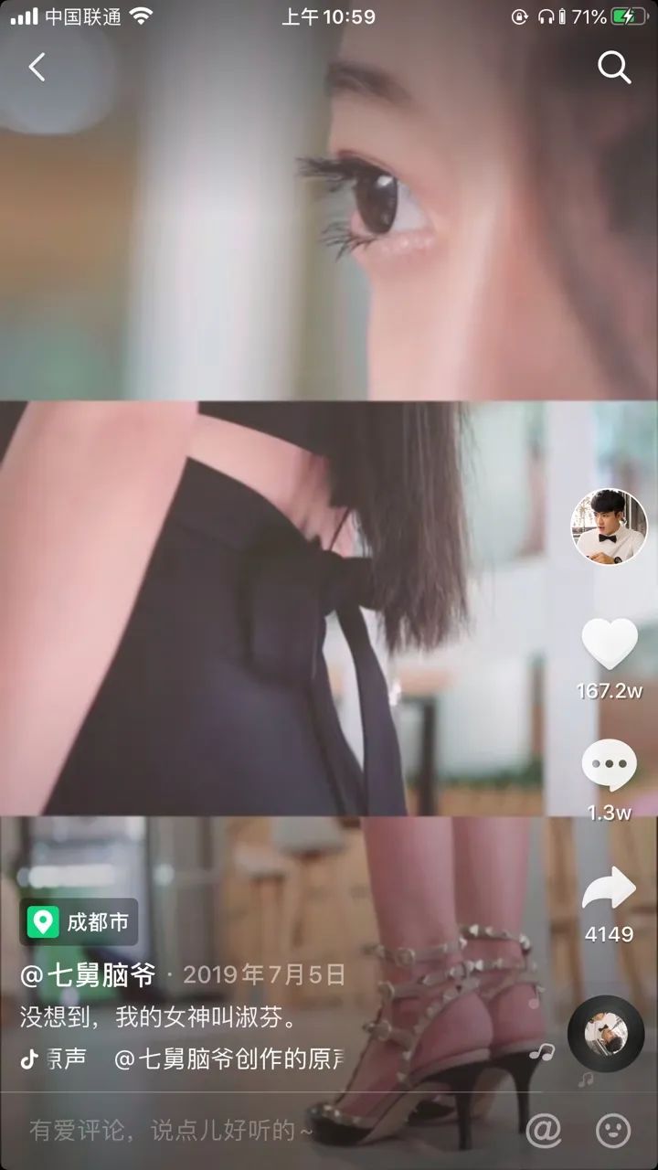 直到2019年7月,“七舅脑爷”在短视频中上演了与女神相遇的戏码,这位女神“赵兮雪”也是他现实生活中的真女友。
