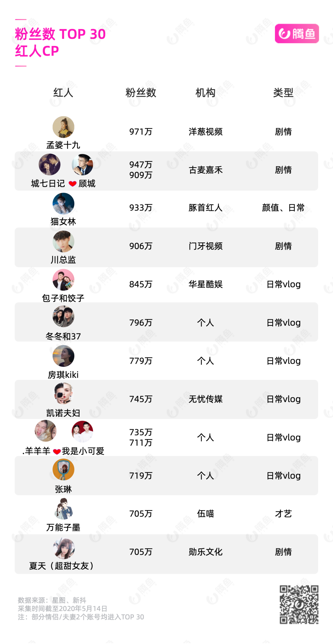 当红人没有签约MCN时,大多以其中一个人的账号为主号,个人小号往往与大号粉丝量差距极大,甚至没有小号。但在头部MCN的加持下,一对情侣cp的两个账号都能够进入榜单TOP30,比如“晨妍”&“黄锦鸿”、“顾城”&“城七日记”。
