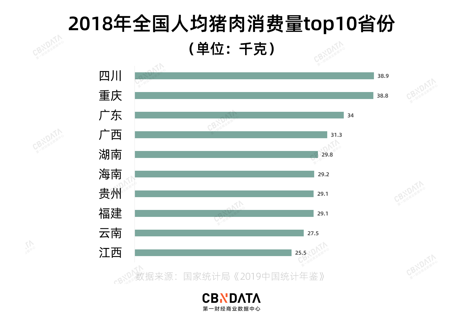 国家统计局《2019中国统计年鉴》显示,川、渝地区以将近40千克的人均猪肉消费量荣登2018全国猪肉消费大省冠、亚军。白花花的猪肉,成了四川人餐桌上的回锅肉,广东人碗里的沙姜猪手,湖南人下饭的辣椒小炒肉……