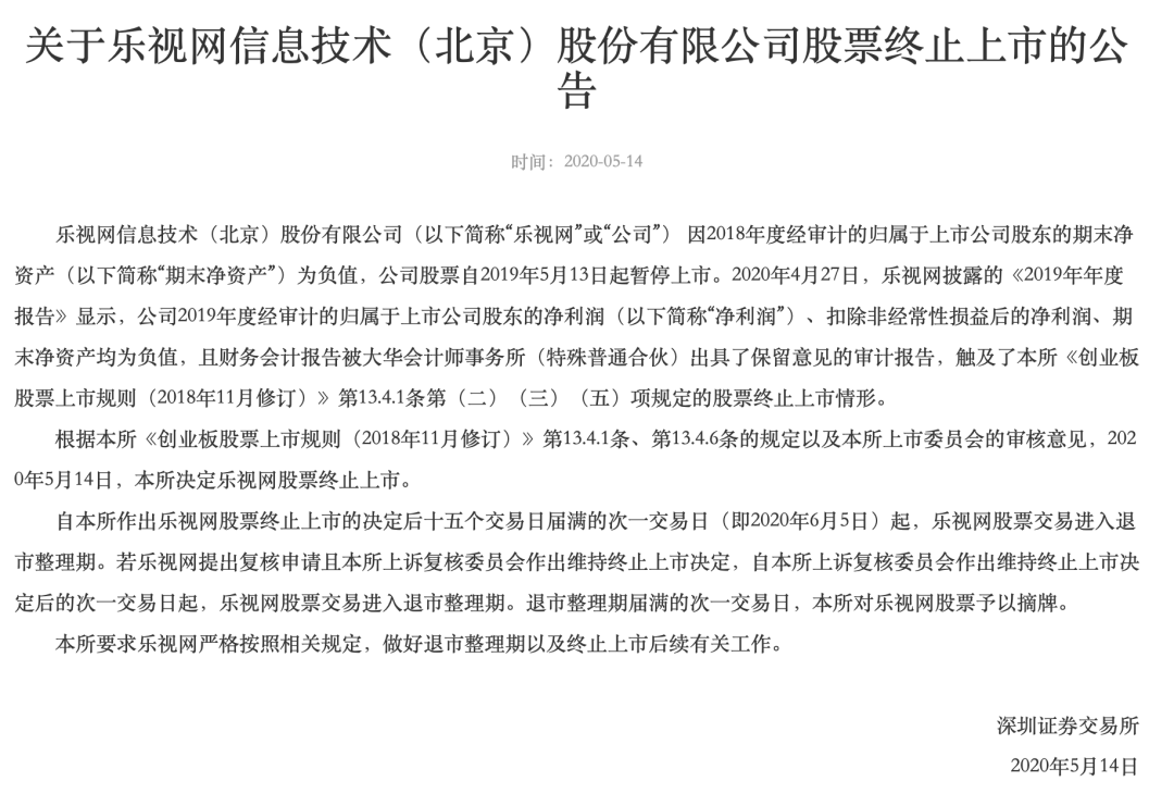 5月14日,深交所公告称,乐视网股票终止上市,自2020年6月5日起,乐视网股票交易进入退市整理期。退市整理期届满的次一交易日,乐视网股票将被摘牌。