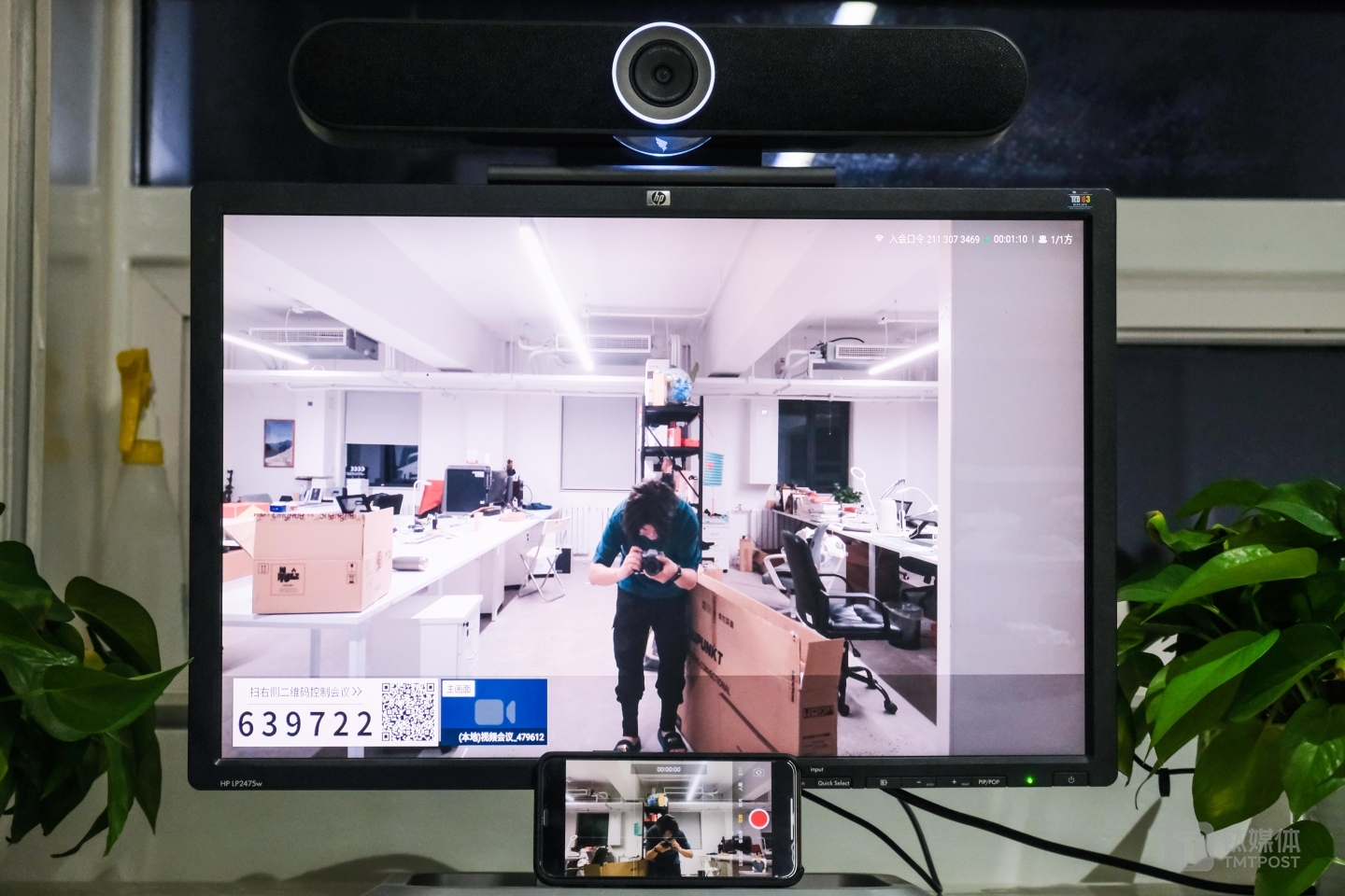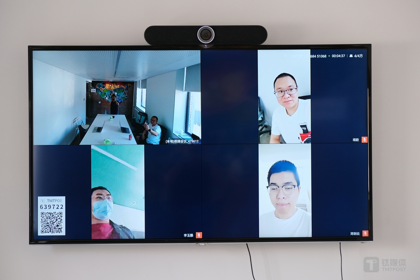 钛媒体的无线网络环境带宽非常好,我们测试了四人分别使用无线网络环境在会议室中手机接入,一个人在其他办公室用手机4G信号接入,其他两人采用无线网络在楼道茶水间接入的方式,来模拟移动办公中几方同时参加线上开会情景。实际上连接画面很稳定,也没有延迟,声音干净清晰。