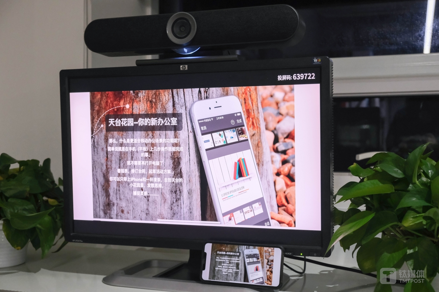而在较为嘈杂的环境里,笔者推测机身内集成的麦克风是指向性的,即只会收集前方传来的声音,同时配合降噪算法,通话效果也不错。顺便一提,钉钉F1视频会议一体机是有指示灯的:当设备开启的时候,摄像头下方印有“钉钉”字样的亚力克面板会亮起;而当用户开启摄像头进入到会议的时候,摄像头周围会亮起一圈提示灯,对与会人员是一个很好的提醒。你再也不用担心结束会议之后,忘记关闭摄像头了。作为一整套的会议解决方案设备,它除了能够发起视频会议之外—它还支持投屏功能。在进行演示的时候,你可以通过扫码或者输入投屏码的方式,将手机上的内容实时地展示到屏幕上。如果是iOS设备,还可以通过AirPlay的方式将手机的文件投射上去。无需通过线缆的方式,整个操作过程不需要任何线缆,非常地便利。