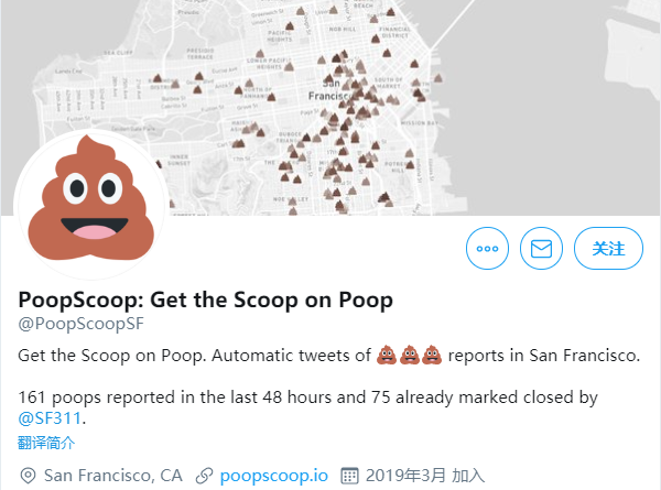 截图中所显示得名为@PoopScoopSF的账号下显示在过去的48小时内报告了161起便便问题,其中75起已经被旧金山311所解决。明显,处理的速度赶不上便便生产的速度。