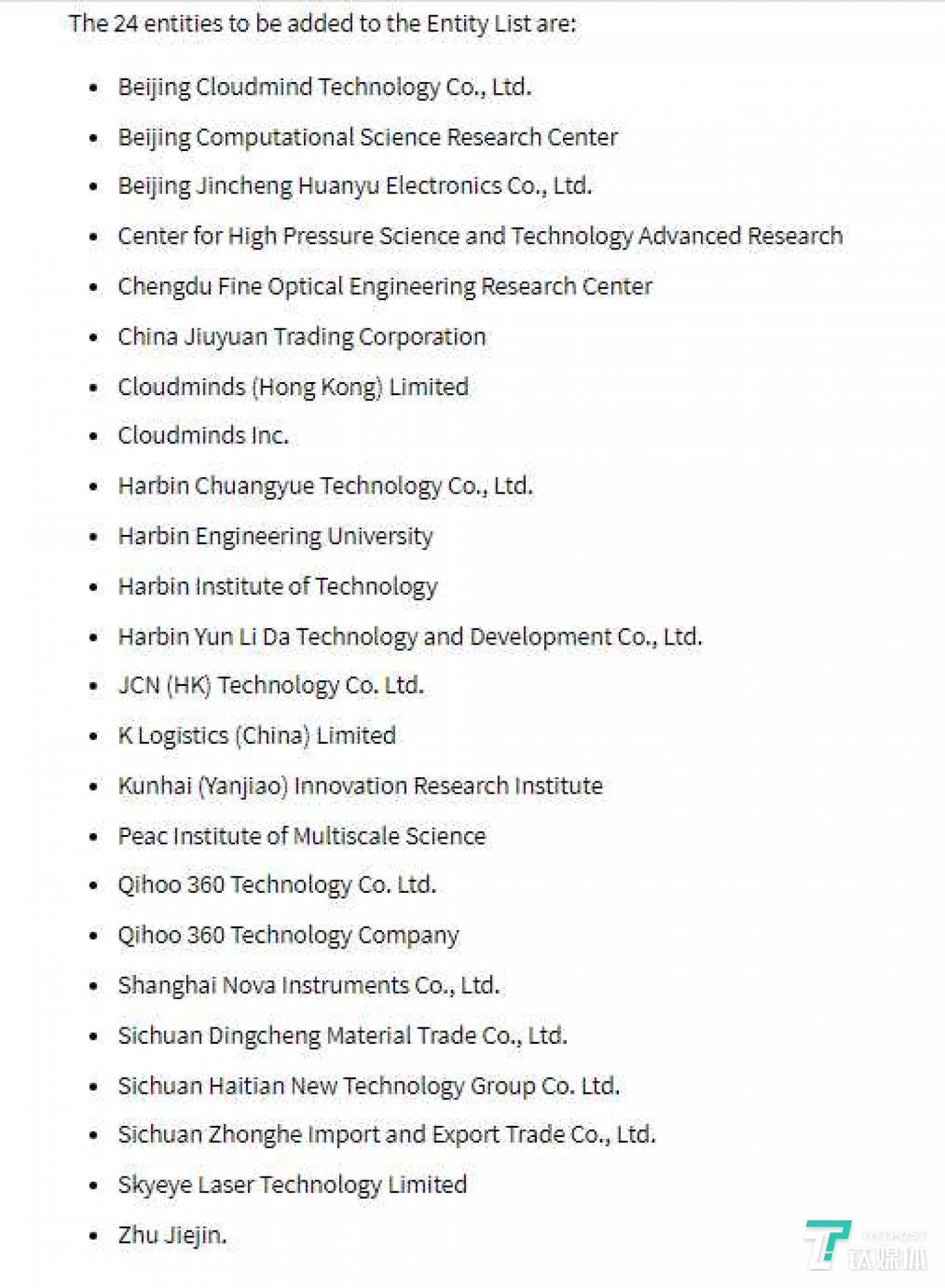 5月23日凌晨,美国商务部宣布,将共计33家中国公司及机构列入“实体清单”,称其在支持采购用于中国军事最终用途的项目方面存在重大风险。当中包括北京计算机科学研究中心、奇虎360、 哈尔滨工业大学、哈尔滨工程大学、云从科技、东方网力等科技企业/机构。