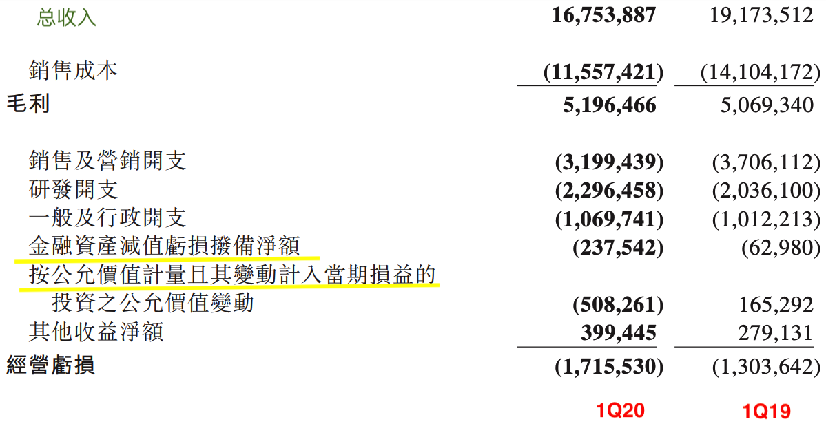 一季度没有像往常单独披露各分部业务的毛利率,直接给出了经营利润/亏损,这要从收入扣除成本、三费、投资公允价值变动、计提金融资产减值、其他收益净额,一路扣下来得出经营利润/亏损。统计颗粒度更粗了,但仍可通过一些分析看出分部毛利率的变化趋势。