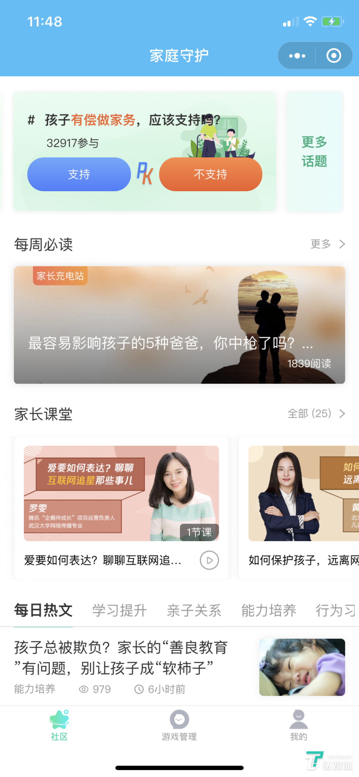 成长守护平台中藏着Lanky团队的小心思,打开【成长守护】模块的【家庭守护】功能,第一个页面并不是孩子的游戏时长管理,而是大量关于网络素养、亲子关系、家庭沟通等内容与课程,这些均是免费内容。