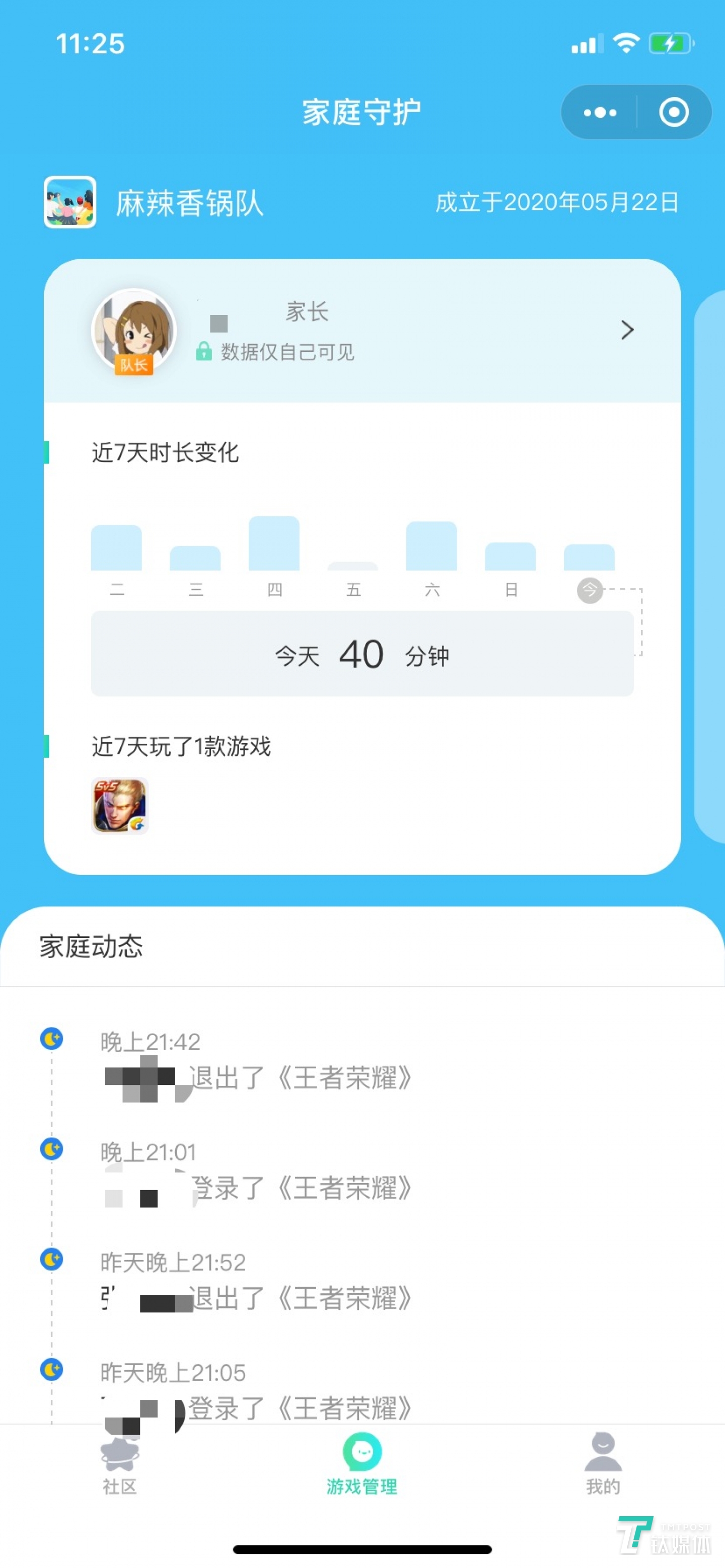 使用门槛极低,有手机有微信的家长都可以将小孩的账号添加进来,在【游戏管理】页面随时了解孩子每天的游戏时长和登陆时间。