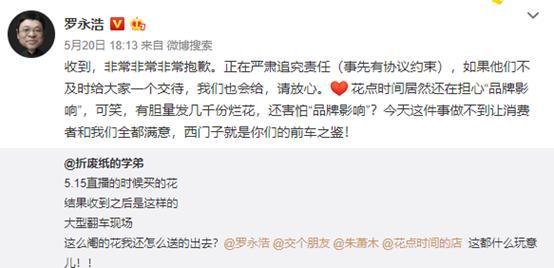 只是产品质量问题也接踵而至。刚刚过去的520便有大量网友表示罗永浩带货的“花点时间”玫瑰存在质量问题,随后罗永浩发表致歉声明,并表示全额退款的同时再额外赔偿一份现金。虽然补偿措施诚意满满,但是直播带货的产品质量问题仍然被推上了风口浪尖。