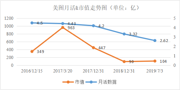 但在上市后,美图的月活用户数出现连续下滑,2019年7月的该项数据相比2016年已经下降了42%。随着这个数据下降的是市值,2019年7月,美图的市值已跌至104亿港币,相比高峰时的963亿港元下跌89%。