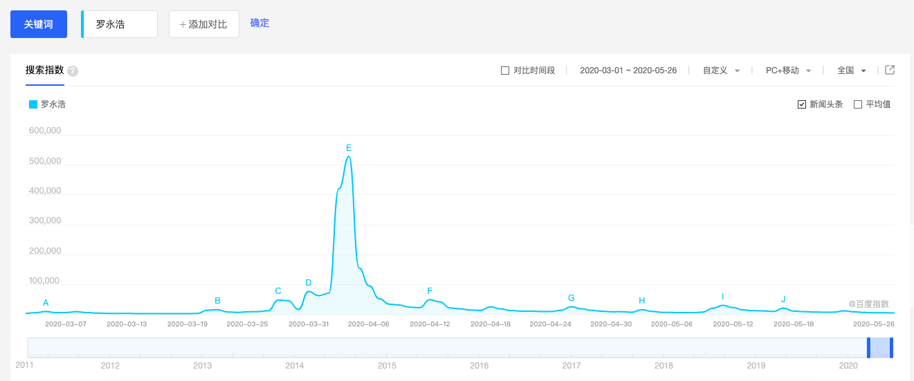 罗永浩直播带货的4月1日前后,“罗永浩”百度指数暴增,最高超过50万,是其首次直播期间拥有巨大的全网关注度的佐证。某女企业家直播破纪录,不论是3亿那场还是7亿那场,百度指数没什么波澜,且最高不到罗永浩的二十分之一。