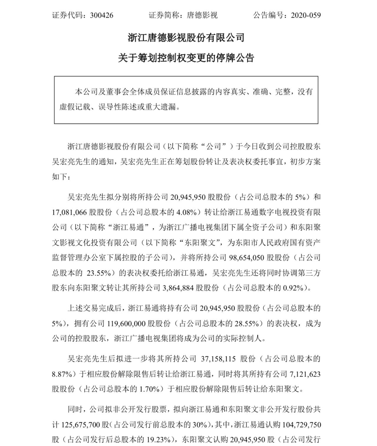 到晚间,唐德影视的发布的《关于筹划控制权变更的停牌公告》坐实了猜测。公告表示,控股股东吴宏亮将转让自己所持5%公司股份给浙江易通数字电视投资有限公司(浙江广电全资子公司),同时将所持公司23.55%的表决权委托给浙江易通。