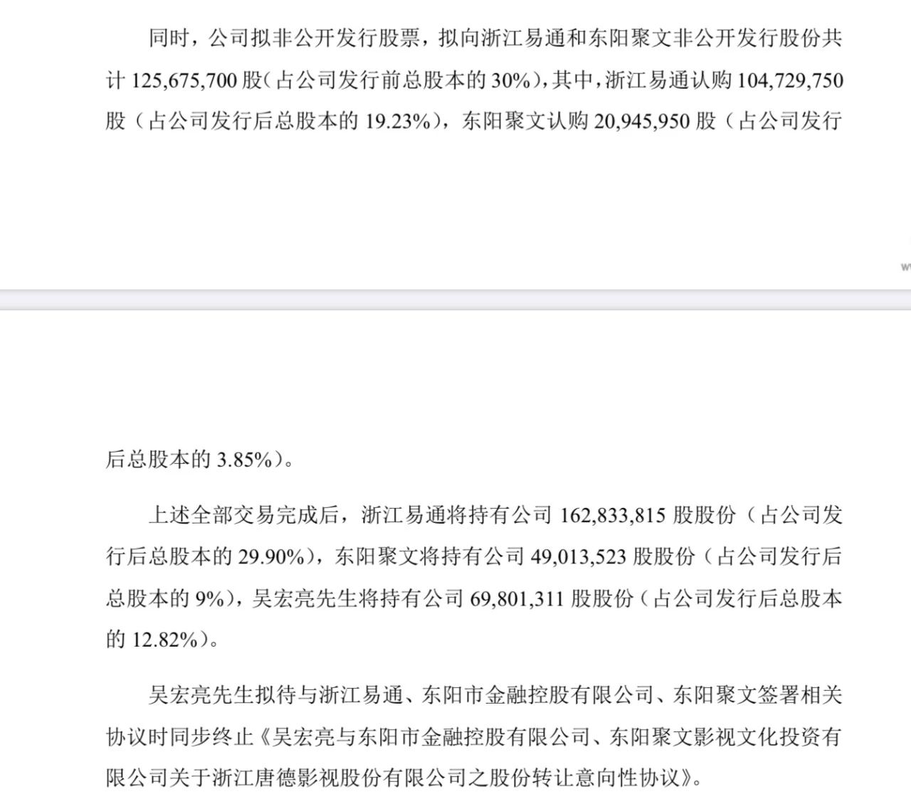 而剩下的股权部分,唐德将以定增的形式,向浙江易通和东阳聚文非公开发行30%股份共计125,675,700股,二者分别认购19.23%和3.85%。全部交易完成后,浙江易通持有29.9%股份,东阳聚文持有9%,吴宏亮持有公司12.85%股权。
