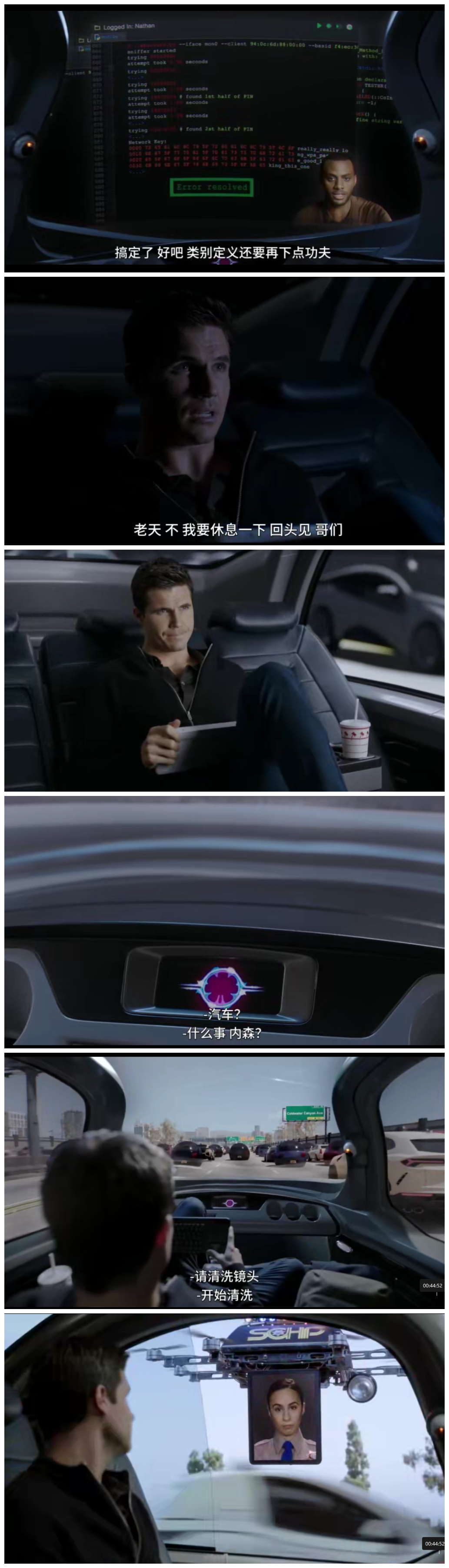 男主角和面前屏幕上的“AI人”热烈议论讨论了一番代码后,强行把TA关闭,屏幕退出,周边亮起,原来男主角正在行驶的一辆无人驾驶车里的后座上,一边喊话“汽车,请开始清洗镜头”,一边开始用手柄给车加速,希望快点到达岳母家参加聚会,但因车速过快马上迎来了无人机交警的盘问,最后只好乖乖行驶。