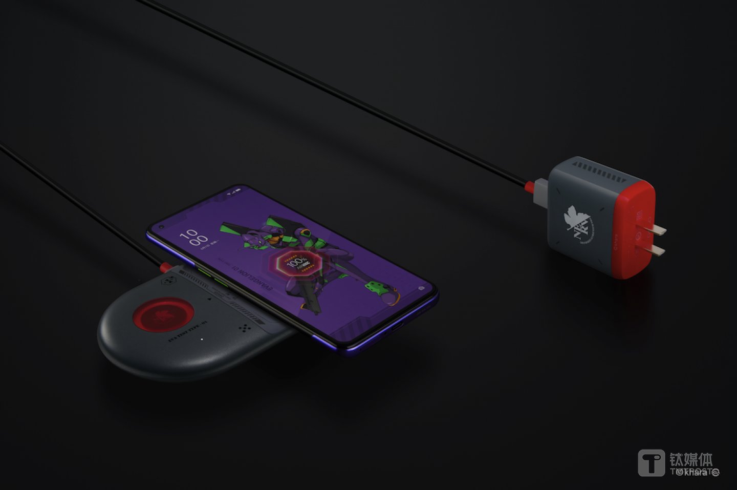 包装内部定制了灵感来自朗基努斯之枪的卡针,Nerv 元素的定制耳机,以发射地台和电缆为灵感的 65W 超级闪充充电套装。定制手机壳采用与RG初号机的双色一体成型相近的双色注塑工艺,更加轻薄的同时还加入了出击字样。