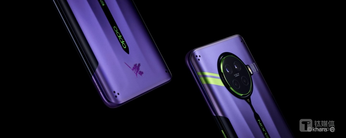 OPPO Ace2 EVA 限定版以初号机为设计来源,整机的紫绿色的配色比例与初号机相近。定制机四个角各有三个对称的黑点,来源于初号机胸口、腿部的 6 个点。