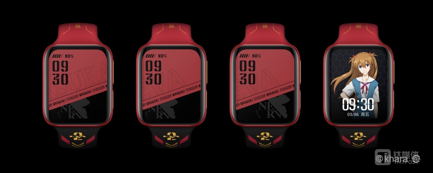 OPPO 还提供红黑两组氟橡胶表带,复刻了多款明日香和二号机动态表盘。定制版手表支持 Watch VOOC 闪充技术,全新定制了充电动画。