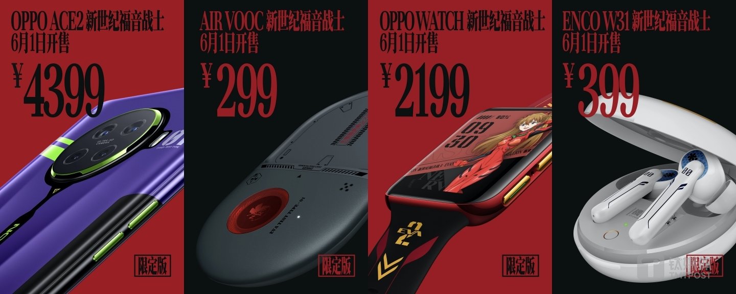 钛媒体快讯 | 5月28日消息:OPPO今天正式推出 OPPO Ace2 新世纪福音战士限定版,并同时发布 OPPO Watch、OPPO Enco W31真无线耳机、OPPO 40W AirVOOC 无线闪充充电器等产品的新世纪福音战士限定版,此外即将发布的智能手环 OPPO 手环也以新世纪福音战士限定版的方式首次亮相。
