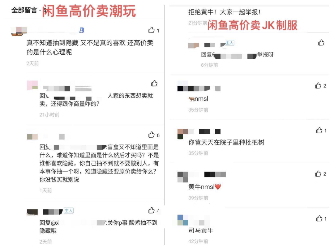 “匪夷所思,潮玩圈从不这样。价格能接受就买,为了十块钱来骂一个陌生人真是特别幼稚。”小简回忆起这件事依然忿忿不平。而就在那几天,波点少女领结成为闲鱼上的靶子,只要不是原价售卖的链接都有又酸又脏的留言,很难想象是十几二十来岁,穿着JK制服看似清纯的女孩所说,高价链接和骂人留言也逐渐成为闲鱼JK制服热款的必备光景。