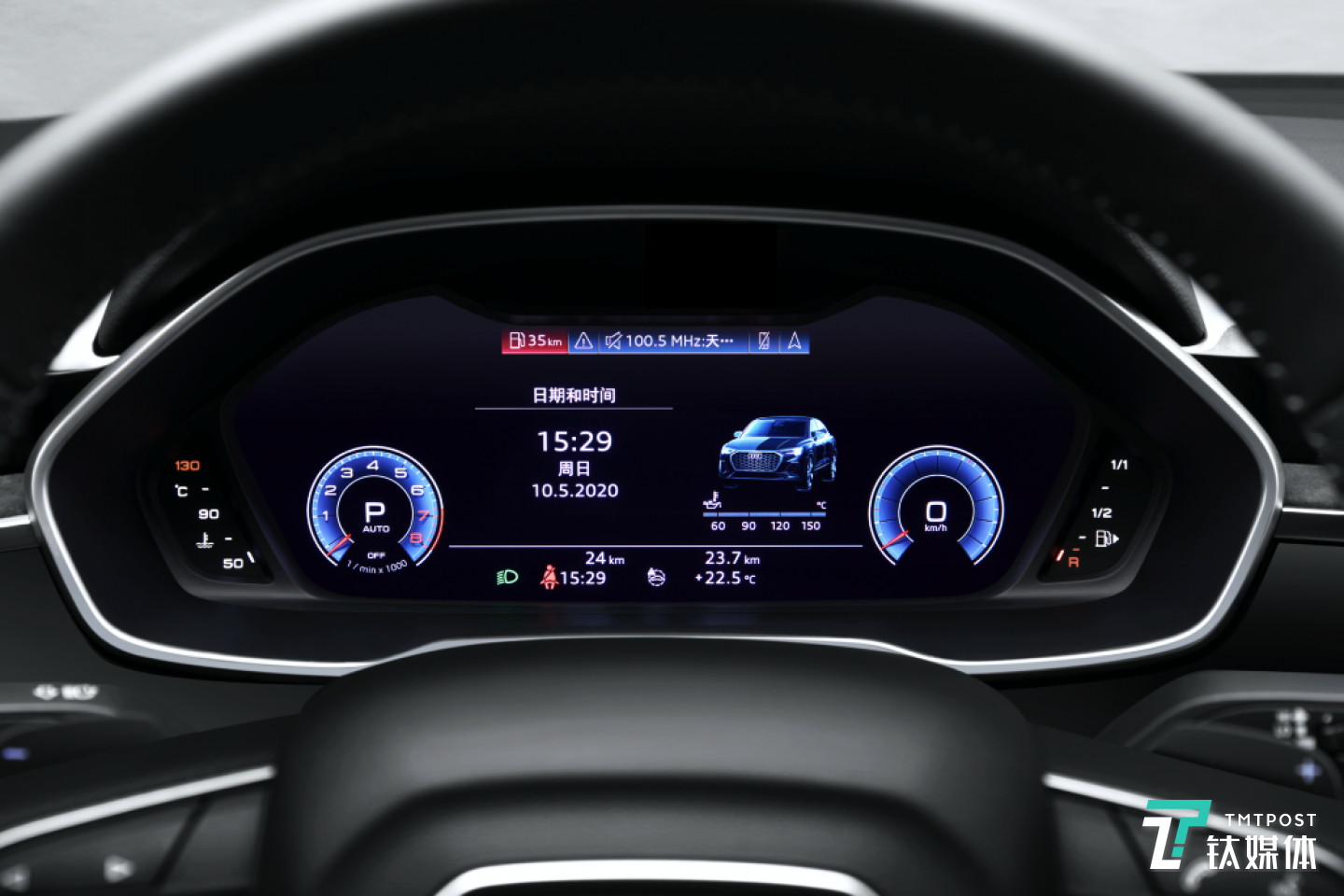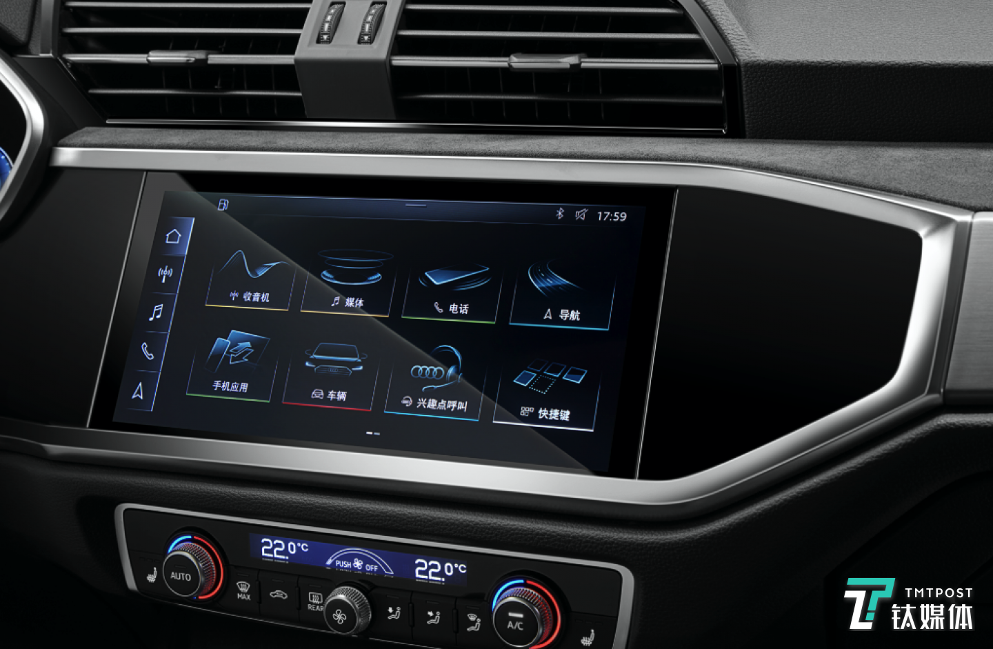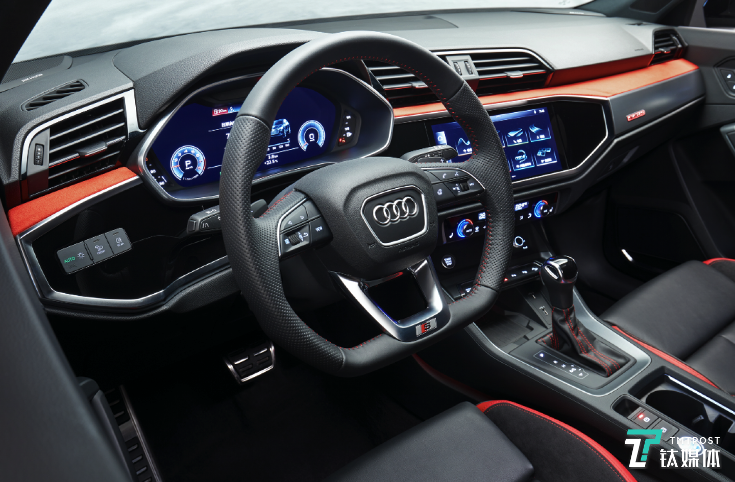 奥迪Q3轿跑的分段式仪表台,将空调出风口移到上层,高解像素信息娱乐触控屏幕置于下层,中间以仪表台上饰条分割。
