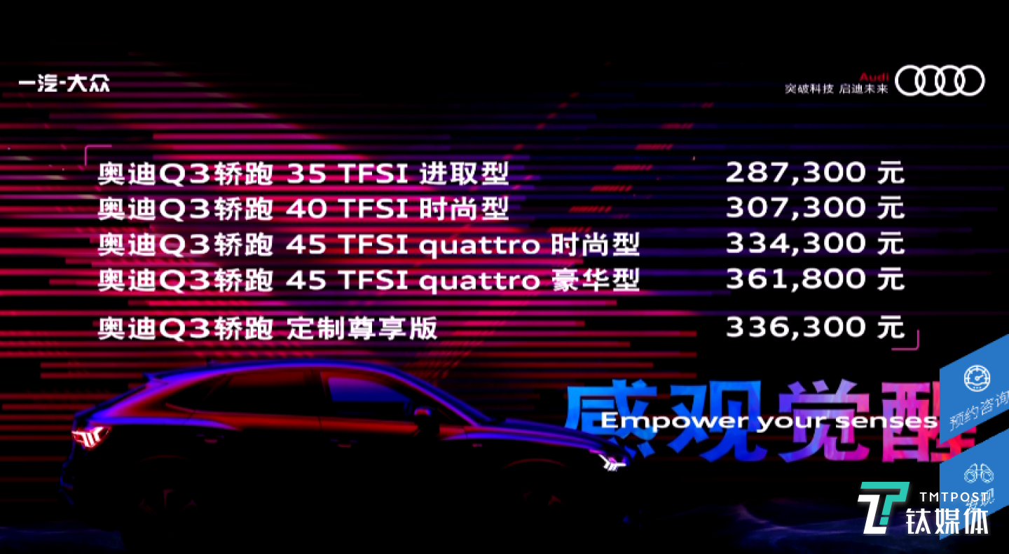 售价方面,奥迪Q3轿跑全系共有5款车型,售价区间为28.73万~33.63万。(本文首发钛媒体,作者/Kiwi)