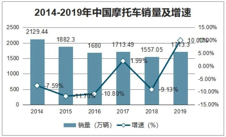▲ 2014-2019年中国摩托车销量及增速/源自中国产业信息网