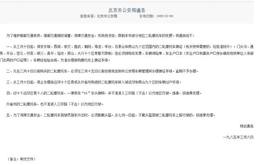 ▲ 1985年的北京市公安局摩托车限行通告,拉开全国禁限行的序幕