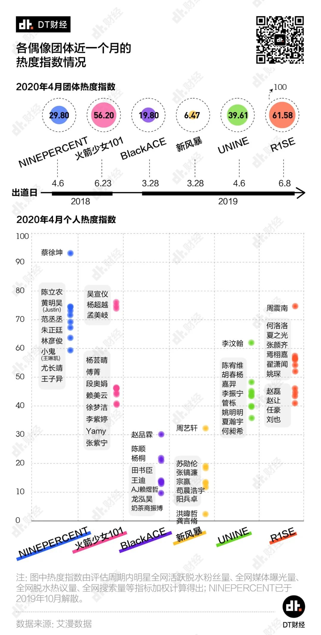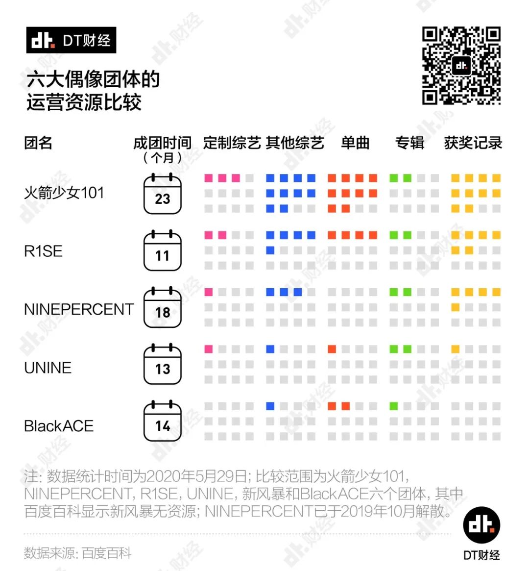 今天的偶像工业能为我们输出多少成功案例?这个时代到底能留下哪些偶像?我们选取了从不同101式综艺中走出来的六个偶像团体(火箭少女101、R1SE、NINEPERCENT、UNINE、新风暴、BlackACE),通过成团后的热度、后续资源等多个维度上的对比,试着探究在偶像工业化体系下,造星链条中的关键环节究竟是什么。