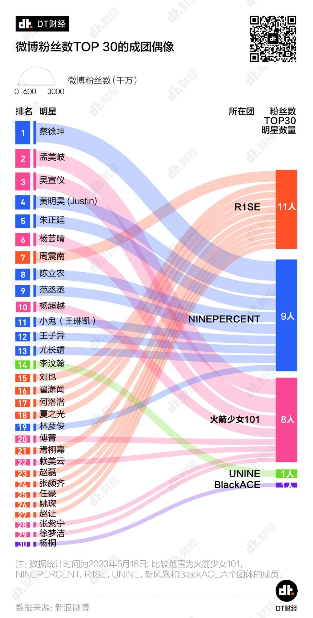 6个团体微博粉丝数排名TOP 30的偶像中,回归个人经纪公司的NINEPERCENT和仍处于成团上升期的R1SE全团入选,火箭少女也占去了8个名额。