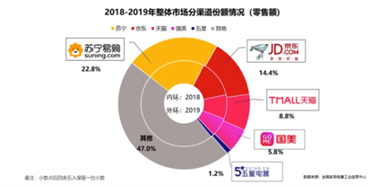 全国家用电器工业信息中心数据显示,苏宁家电渠道优势明显,不仅承包大润发超市的家电部分,且开辟了零售云,收购万达百货和家乐福,加之线上配合,拿下了家电22.8%的市场份额,成为全渠道第一,老对手国美已经收缩至5.8%的市场占比,京东较之亦有8.2%的差距。