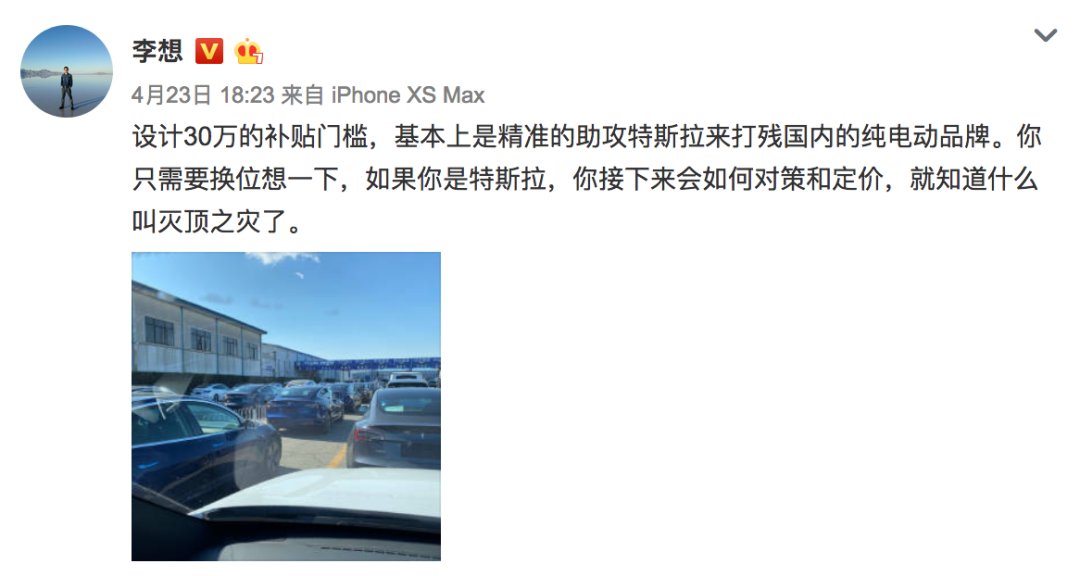 早前,在最新新能源补贴政策30万元门槛出来后,理想汽车创始人李想在其微博直言“基本上是精准助攻特斯拉来打残国内的纯电动品牌”,并将其形容为“灭顶之灾”。