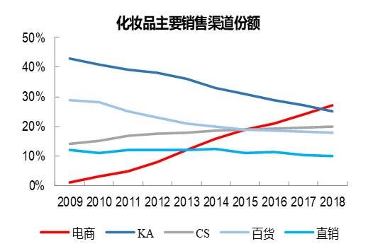 根据Euromonitor,电商渠道2018年以27.4%的市场份额超越KA渠道成为第一大销售渠道,2013~2018年复合增长率25.6%,居各渠道之首。