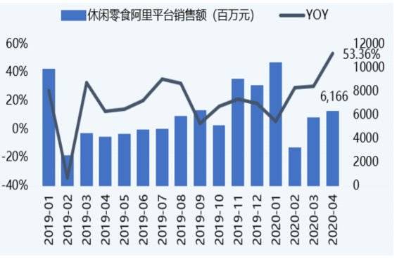 2020年4月,随着疫情后消费习惯加深、物流恢复,休闲零食线上增速进一步上升至53%。