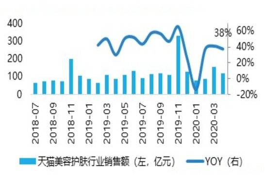 2020年,天猫美妆行业继续保持高增长,4月增速再度上升至38%,且国货品牌增速显著高于国际大牌。