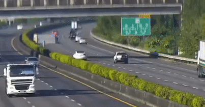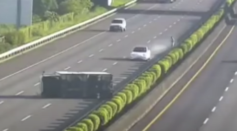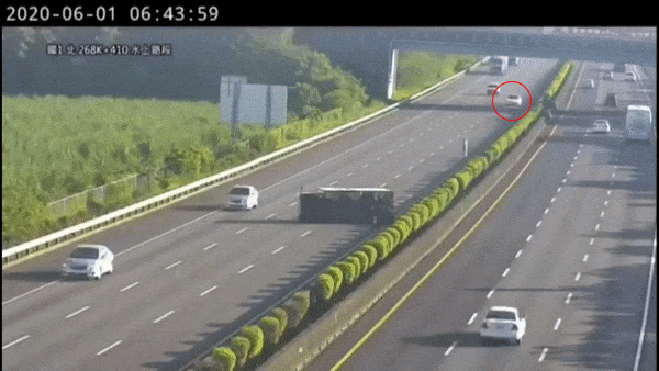 事情发生在台湾。上午6点44,光线条件算不上极端,高速路上,一辆货车侧翻在地,后续来车纷纷避让。