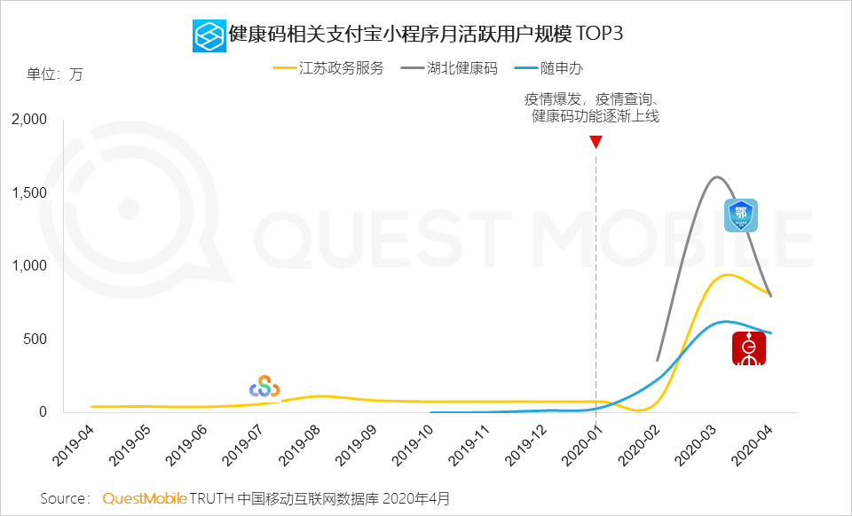 1.2 江苏政务服务、湖北健康码、随申办等政务类小程序,在疫情后,增加健康码和疫情公布功能,用户量激增