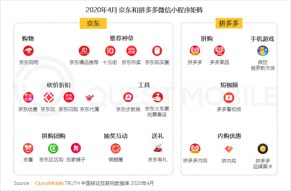 1.2 拼多多、京东纷纷铺开小程序矩阵,全面覆盖拼购、砍价、内购、种草分享等多种场景,聚集特定兴趣用户进行流量变现
