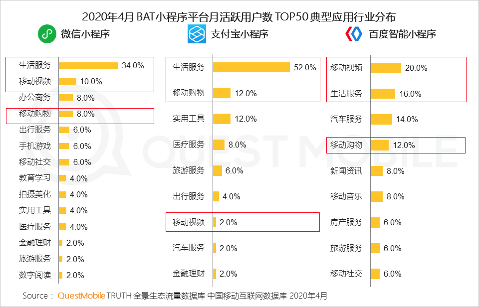 这当中,小程序成了各个平台流量分发的核心展示形态,如微信小程序月活规模已经达到8.5亿,百万以上的微信小程序已经超过1200个,主要分布领域为生活服务、移动视频、移动购物,这背后,与“疫情催熟”有很大关系,例如,健康码的广泛使用,线上消费券的广泛发放,都有很大的刺激作用。