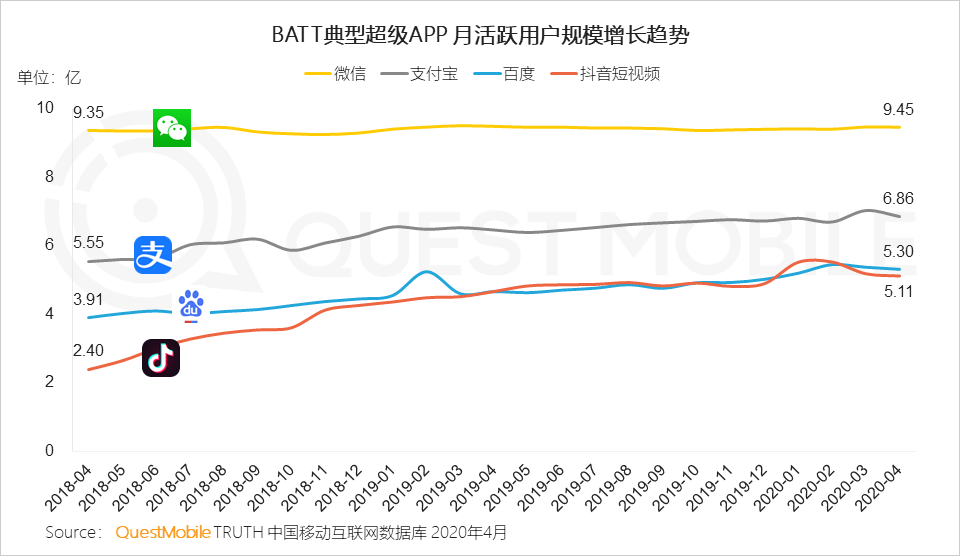 QuestMobile数据显示,过去一年,在用户量增长近乎停滞的状态下,移动用户月人均使用时长增长了12.9%,由2019年4月的128.2小时增长至2020年4月的144.8小时,流量的深度运成为制胜关键,BATT等巨头平台化战略提速,用户挖掘+流量分发:微信的社交流量、支付宝的数字生活流量、百度的智能搜索流量、头条的推荐流量,成了玩家们绕不开的流量通路。
