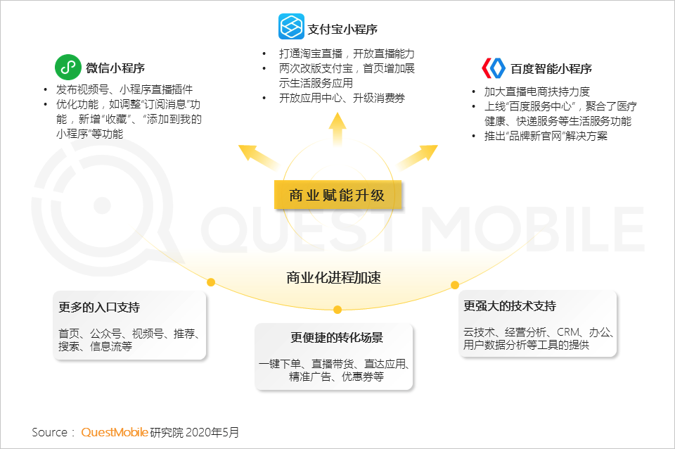 6、平台能力不断开放,视频和直播成为各家布局的重点,商业赋能持续升级,同时各小程序平台的商业化进程也在加速