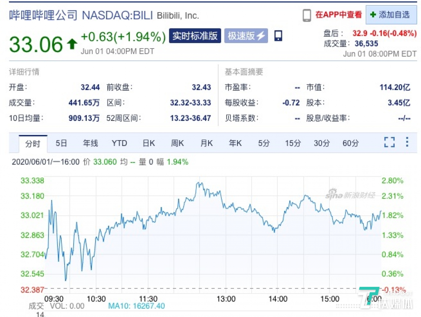 受此消息影响,6月1日美股盘前时段,哔哩哔哩涨逾2%,但盘后涨幅收窄,截至收盘,该公司股价上涨1.94%,至33.06美元,市值约为114.86亿美元。