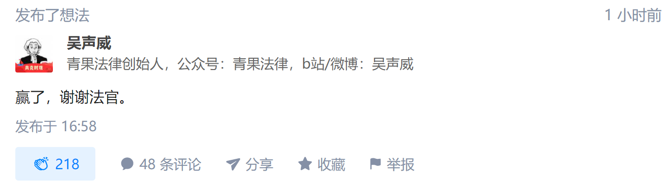 今天下午4时58分,“爱奇艺《庆余年》超前点播”一案刚一结束,原告吴声威就急切地发了这条知乎动态。