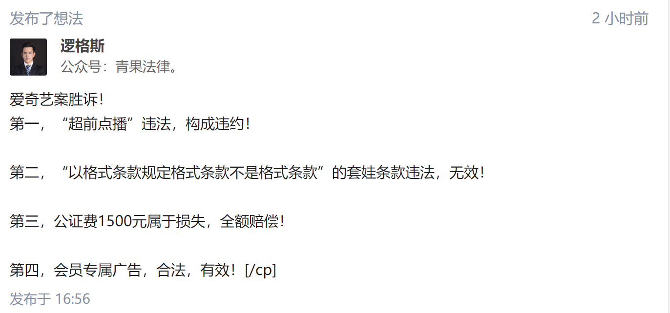 也就是说,如果你在2019年12月8日爱奇艺更改合同之后购买了会员,即可认为是认同超前点播模式,想和这位原告一样胜诉,就不太可能了。此次判例无法惠及他人,具有一定的特殊性。