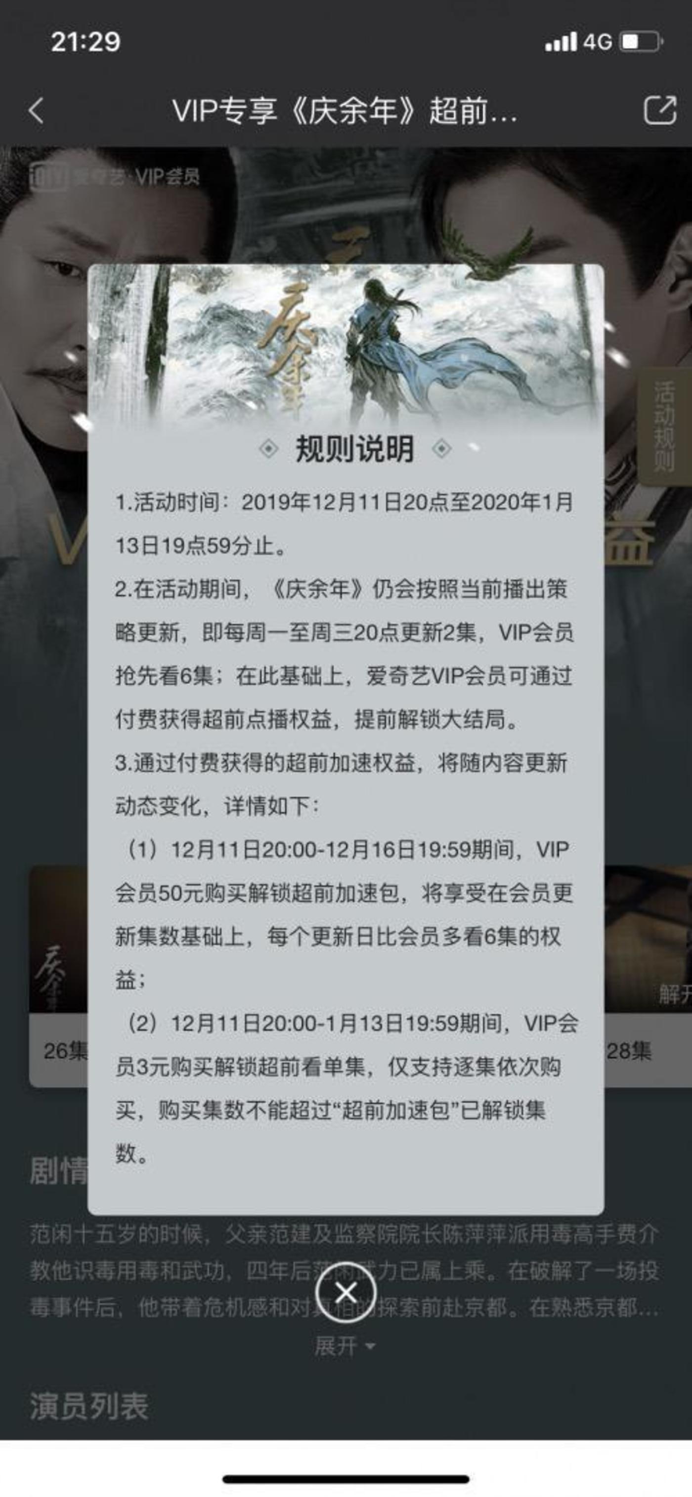 2019年12月,爱奇艺针对电视剧《庆余年》推出了“超前点播”服务。据爱奇艺当时发布的信息显示,在VIP会员可于更新日较普通用户抢先观看6集的基础上,“超前点播”向VIP用户推出可再多看6集的权益,但要获得这项特权,VIP用户需再次进行付费,以单集付费购买或是一次性付费的方式解锁,而单集付费购买的价格为3元/集,一次性付费解锁则需缴纳50元。