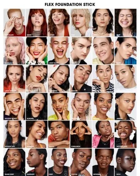 另外,Milk Makeup这几年来都没有固定的代言人。他们通常会用Milk Studio的模特来拍摄广告海报或视频。这些出镜的模特,常常风格各异。比如2019年,Milk Makeup推出了Flex系列的粉底棒和高光棒(Flex Foundation Stick 与 Flex Highlighter),这个产品有36个底色。