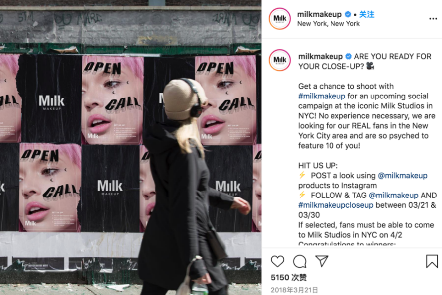 另外,官方账号还经常会做跟粉丝互动的活动。比如2018年在Milk Studio举办社交大趴的前夕,在Ins上发布消息,邀请10名粉丝来参加,让粉丝用相应的标签,贴出自己的美图,并且艾特官方账号。